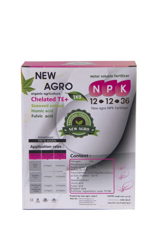 شرکت الوند دانه خمین با برند تجاری نیواگرو بزرگترین تولید کننده و صادر کننده کودهای بیولوژیک و ارگانیک و کلات NPK در ایران و خاورمیانه است. کود ترکیبی شرکت دانش بنیان نیواگرو علاوه بر نیتروژن، فسفر، منیزیم و عناصر ریزمغذی مورد نیاز گیاهان، حاوی میزان بالای عنصر پتاسیم (36%) یکی دیگر از عناصر اصلی مورد نیاز در رشد و باردهی گیاهان میباشد. همچنین به منظور افزایش جذب عناصر و تحمل گیاه در برابر تنشهای محیطی، مقدار متعادلی از آمینواسیدها به این ترکیب کودی اضافه گردیده که آن را به ترکیبی مطلوب جهت رفع تمامی نیازهای غذایی گیاهان تبدیل کرده است. به طور کلی پتاسیم مسئول انتقال کربوهیدراتها از برگها به اندام ذخیرهای مثل دانه، میوه و غده می باشد که شرایط را برای دستیابی به محصول با کیفیت مطلوب، یکدست و خوش رنگ فراهم نموده و به تبع آن عملکرد و کیفیت محصول را افزایش میدهد. استفاده از ترکیبات کودی دارای پتاسیم در زمان گلدهی موجب افزایش ماندگاری گل شده و میزان کمیت گلدهی را به شدت افزایش میدهد. استفاده از این محصول در اواخردوره رویشی و شروع دوره زایشی بعد از گلدهی تا زمان برداشت محصول، به صورت محلول پاشی یا آبیاری توصیه میگردد.